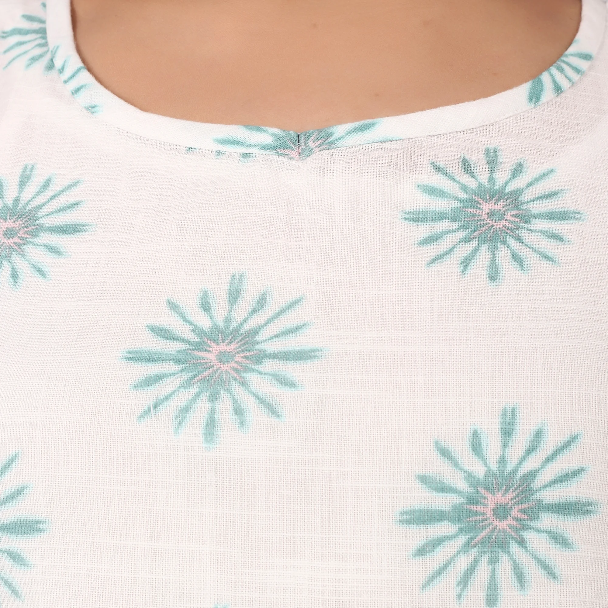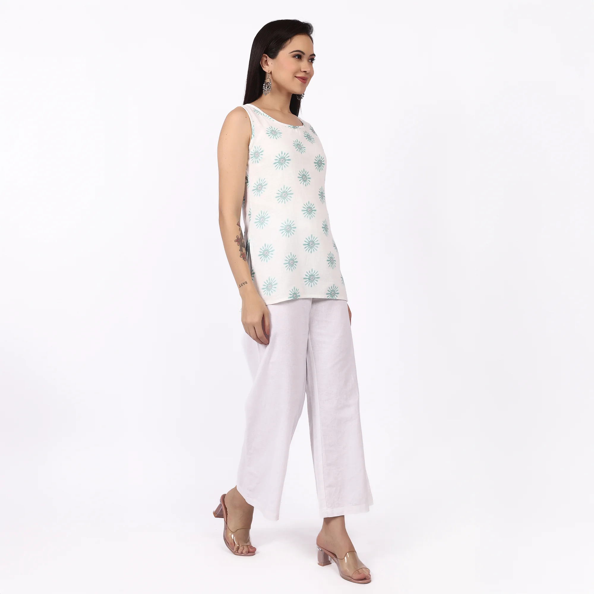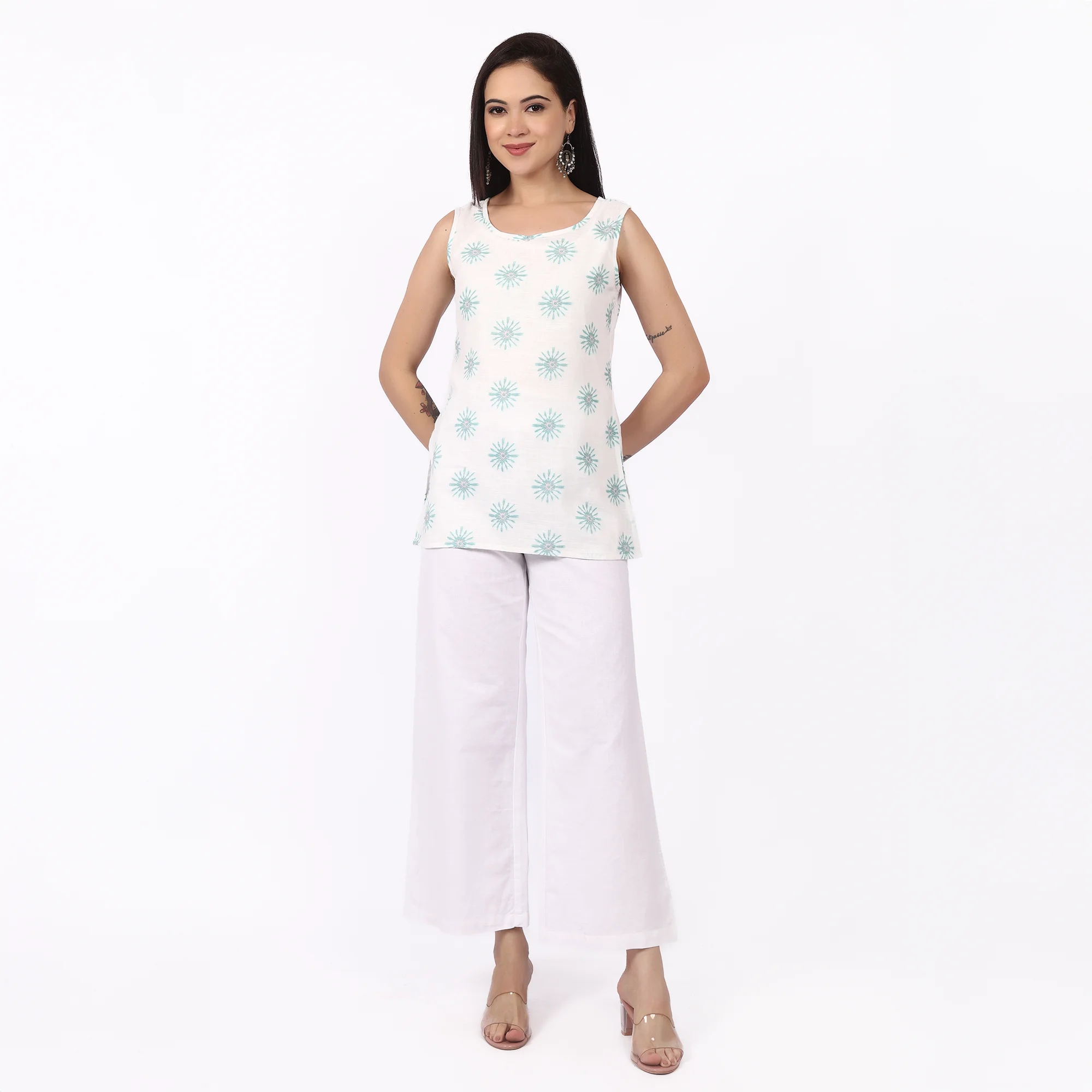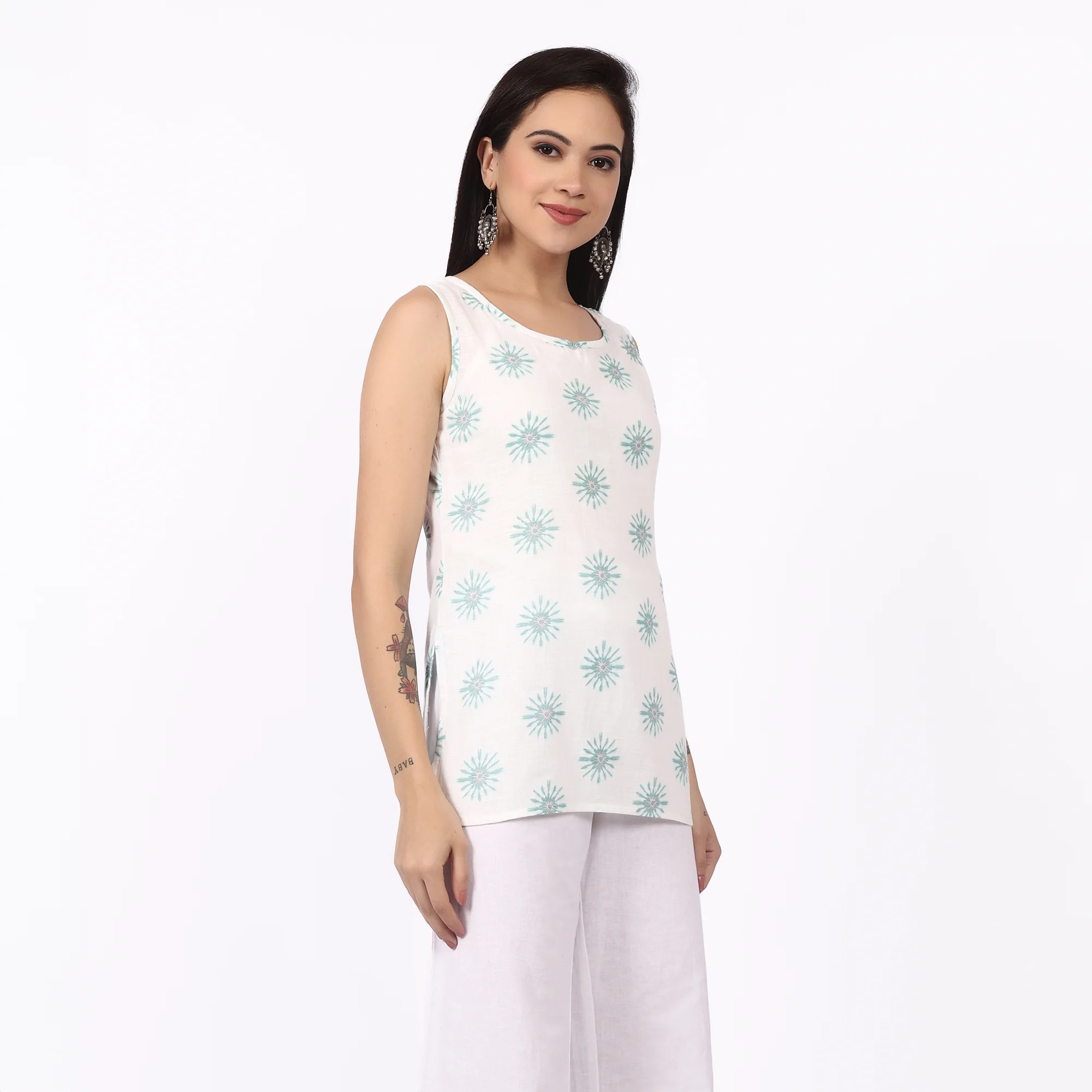 Simple, sweet, and essential for sunny days. The Sky Daisy Tank Top is crafted from a soft, breathable cotton blend that feels amazing against your skin. It features a charming all-over print of delicate blue daisies on a clean white background. The relaxed, slightly flared fit and classic scoop neck make it an easy, versatile piece to pair with everything from white trousers to your favorite shorts. It’s the perfect top for effortless summer style.
